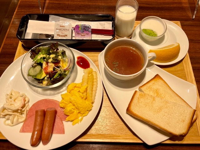 朝食は同じ建物の中のジョイフルで。宿泊者用モーニングセット、和洋各3種類ずつの6種類から選ぶスタイル。ドリンクバーつき。
