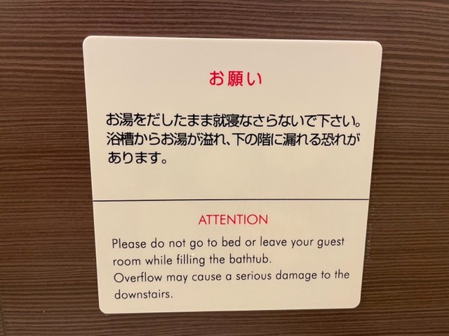 広々とした部屋。バスルームに大事なお願いが貼ってある。