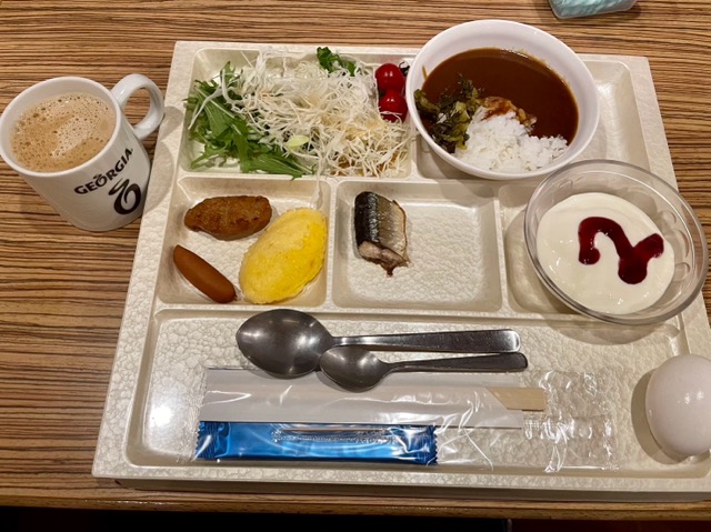 1階に居酒屋があって、朝食もそこ。カレーめちゃ甘口だった。