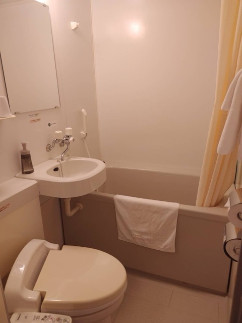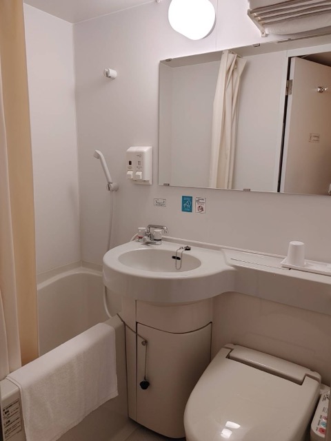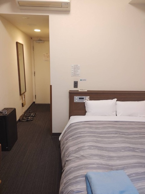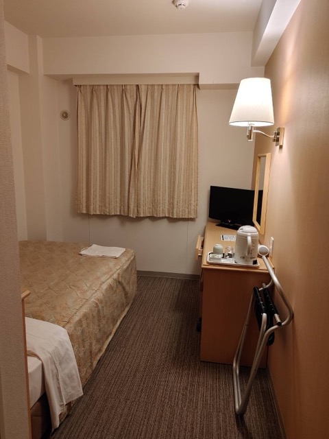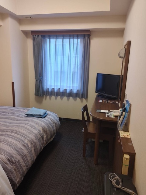 少し古めのルートイン、内装は安定。常々、ルートインの荷物をのせる台は広くて素晴らしいと感心していたのだが、ここは開閉式の10kgまで。少し使い難い。地下に大浴場あり、駅前なので買い物には不自由しない。