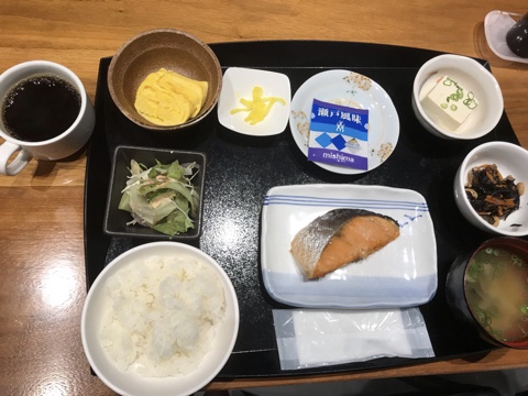 朝食は和食、7時からなので7時に行ったけど、後から出してくれるご飯とお味噌汁以外は冷え冷えで、いつから並べてあるのか気になった。魚がカッチカチで割り箸入らなくて食べるの難易度高い、、でも美味しかった。