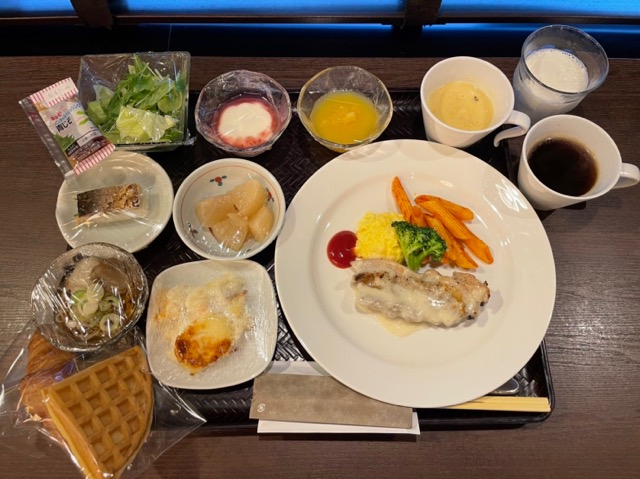 朝食900円。入口で和洋選ぶとトレイに乗せてくれる。小鉢は自由に取ってよくていろいろ楽しい。