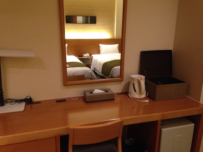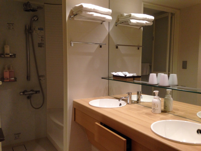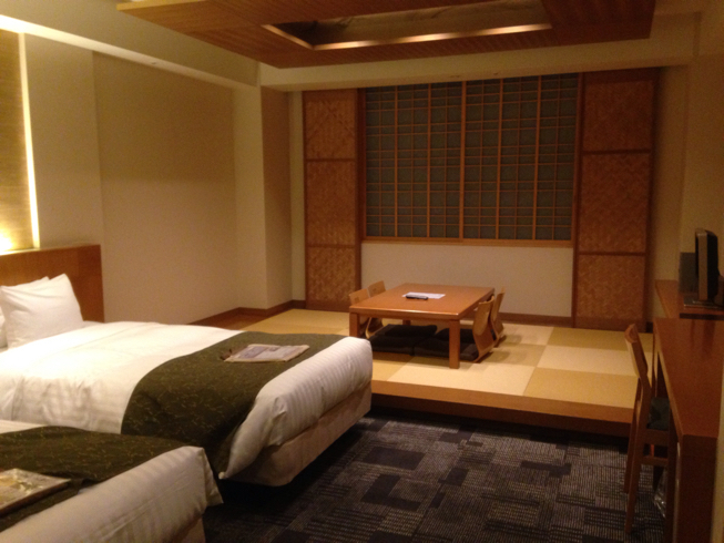 部屋はツインのデラックス(?)で、シャワールームもあるし、洗面台2つあるし、ベッドのむこうに和室空間もあるし、震えた。
