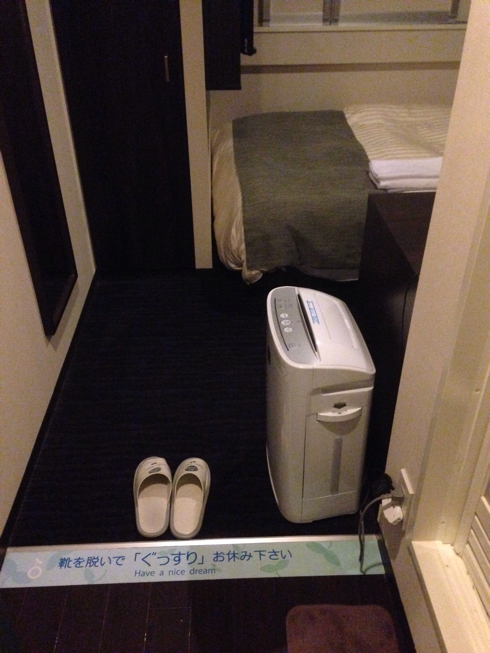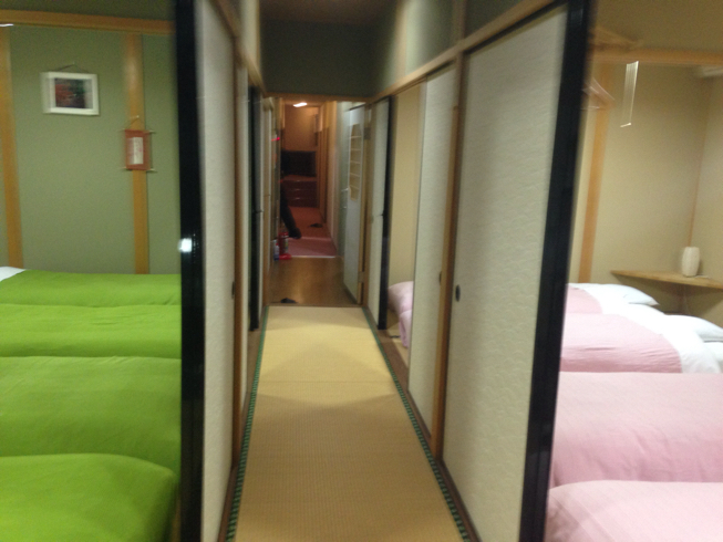 施設入口で靴を脱いだら、施設内は裸足。健康ランドを突っ切ると宿泊棟があって、そこからはスリッパ。