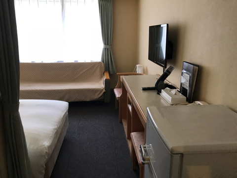 普通の部屋は普通のビジネスホテルの部屋とほぼ同様。浴室はせまく、部屋の壁は薄く、となりの部屋のテレビの音や、近くのスナックやライブハウス?の音が丸聞こえである。