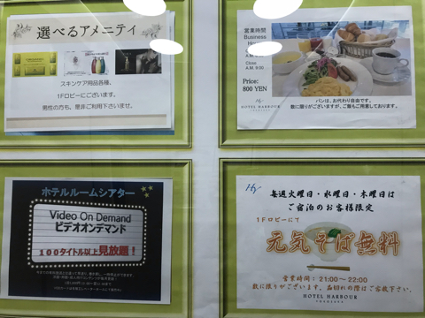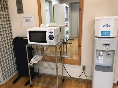 歯ブラシ以外のアメニティはすべてフロントにあり、電子レンジや24時間いつでももらえるドリンクサービスなどがある。