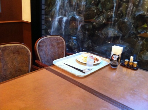 朝食会場は小さな屋内滝が備わっておる。ちょっといい。