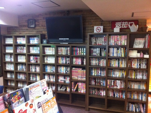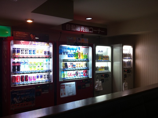 2階に朝食会場があって、自販機コーナーやPCや本棚がある。