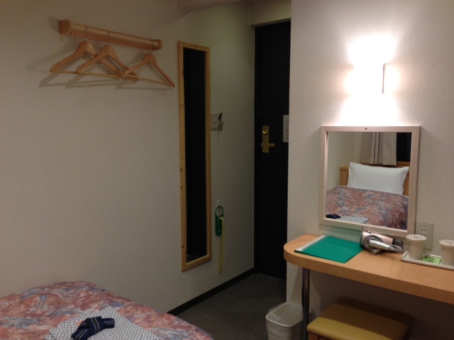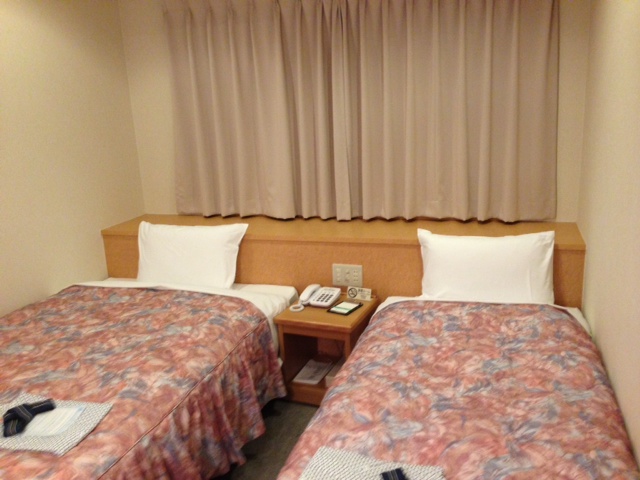 部屋はセミダブルとシングルのツインルームでした。結構綺麗。でもベッド2つ置くには部屋が狭いと思う。机の奥行きもなかなかきゅっとしておりました。