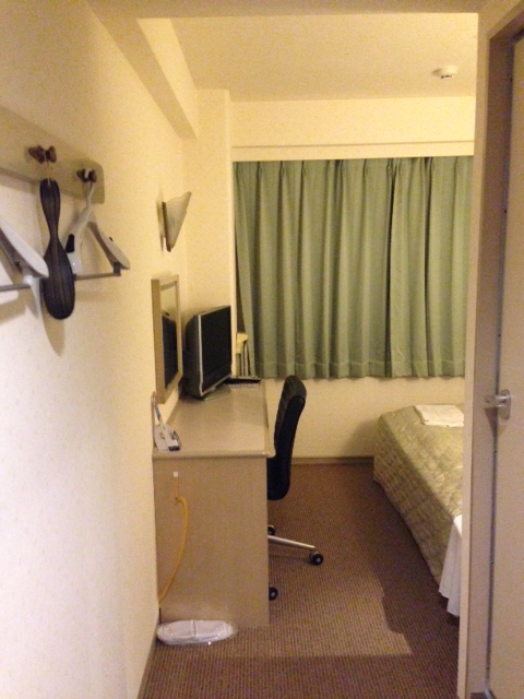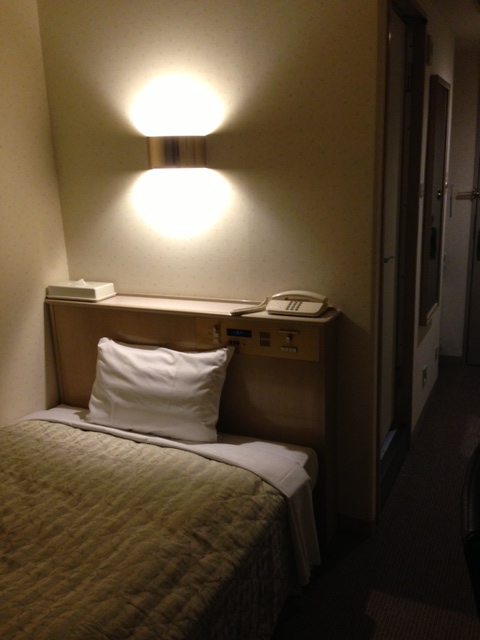部屋の冷蔵庫に発泡酒とグラスが冷やしてあります。サービスだそう。エレベーターの中の貼り紙には「ドラフトワン1本サービス」とあったけど、部屋にあったのは別の発泡酒だった。