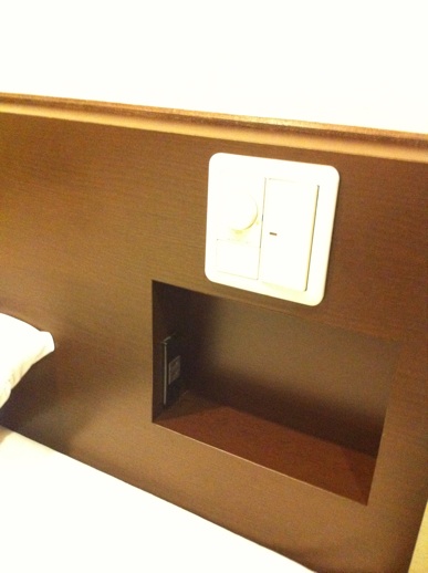 枕元のコンセントスペースが結構良い感じ。500ml缶が立つし。