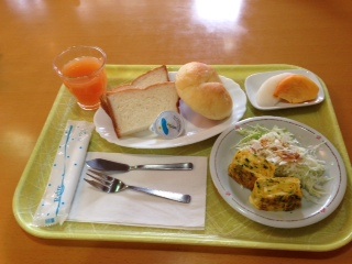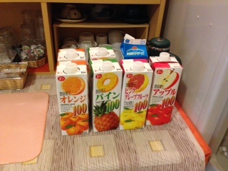 朝食は洋食が300円、和食が700円。チェックインの時に渡される朝食券は無地のプラスチックの札。洋食は和食より安いけど、目玉焼きか卵焼きか選べるし、ジュースも色々あるし、ジャムもりんごにママレードにいちごにピーナッツバターにチョコレートクリームまである。充分です。