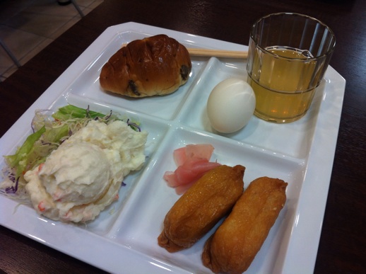 朝食にはいなり寿司や巻き物が。あとパンと野菜とゆで卵。