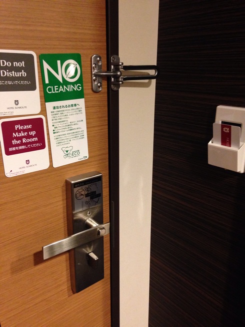 部屋から出る時はドアの取っ手のボタンを押しながら。