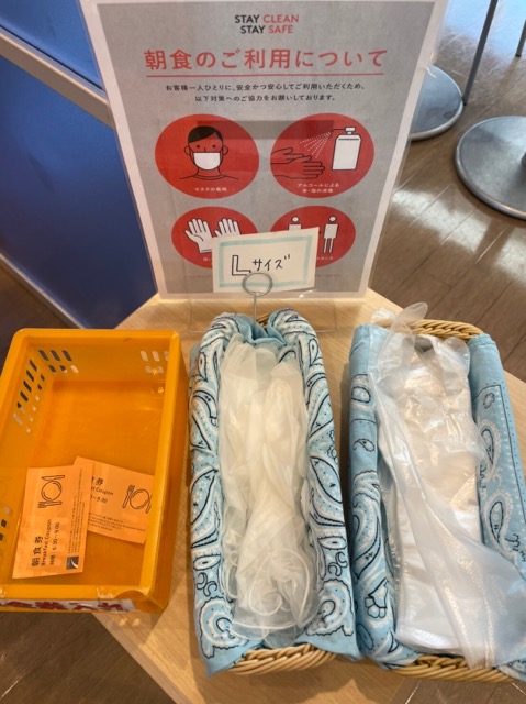 朝食は、取るのに手袋が用意されているけど、あとはいつもどおりのバイキングだった。