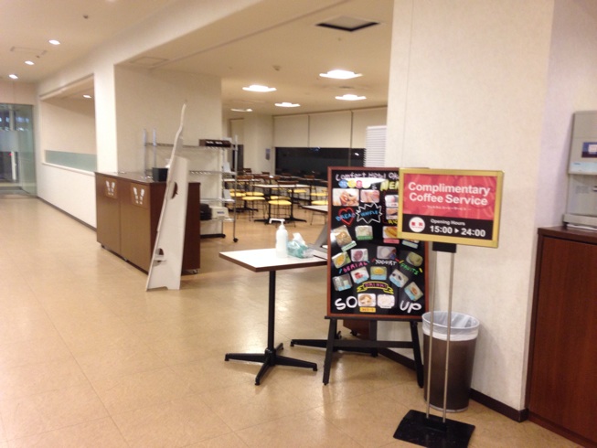ウェルカムコーヒーあり。部屋に持ち帰ってもいいんだよ。