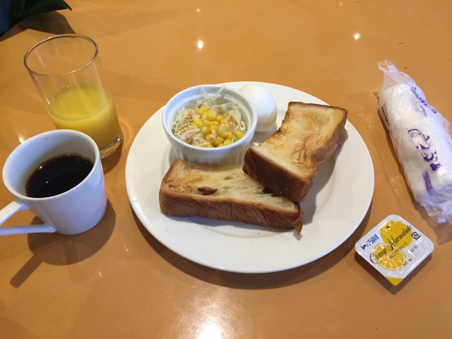 朝食はロビーのカフェで、ささやかなパンとサラダと卵。