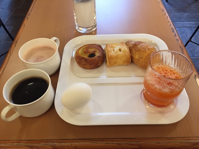 朝食も無料なのでやや簡易。パンとゆで卵。