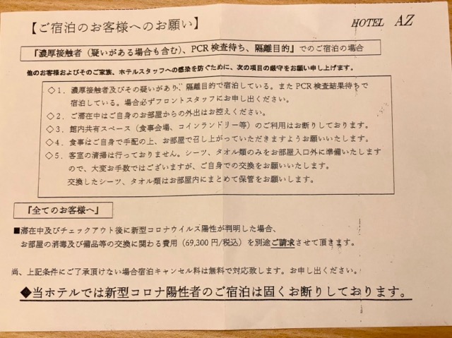 滞在中やチェックアウト後にコロナ陽性が判明すると69300円請求されるようになっていて震える。