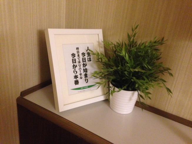 部屋はなんだかちょっぴり広め。格言みたいなのがちょこちょこ置いてある。