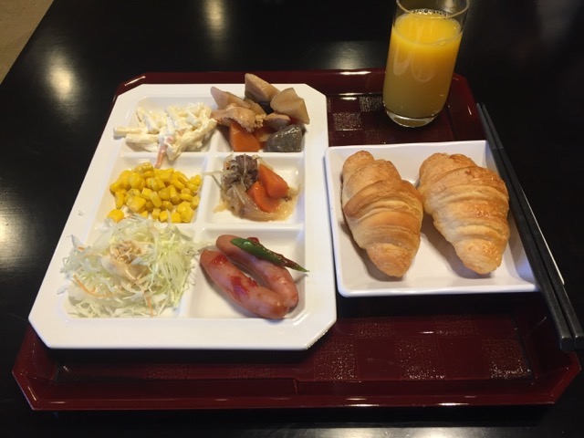 朝食は無料、米もパンもあるけどおかずは和を中心としたもの。