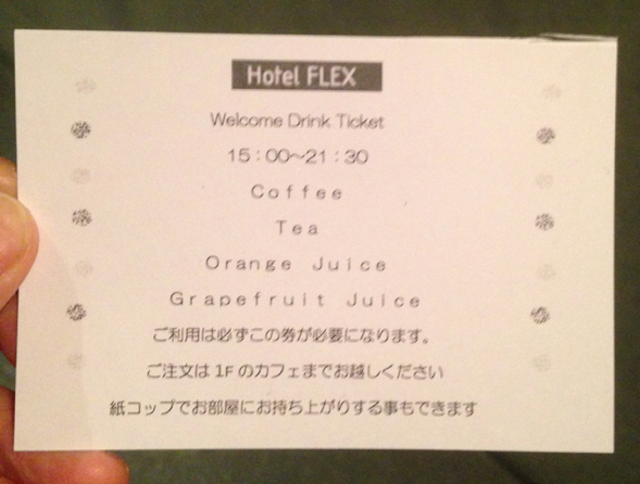 ウェルカムドリンクがあり、カードがもらえてレストランで注文するシステム。しかしそのカードをチェックインの時に渡し忘れたらしく、部屋に何度か電話がかかってきたりした。