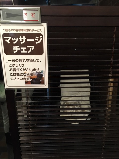 無料のマッサージチェアがロビーに二機置いてある。ブラインドを閉めないと恥ずかしいが、空いていれば誰でも使える。