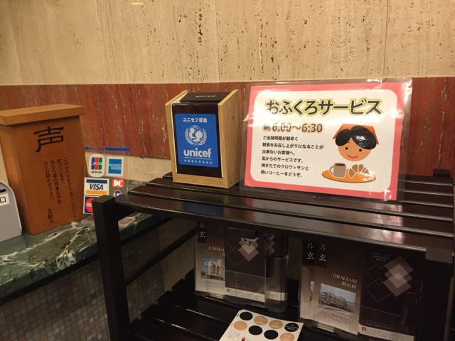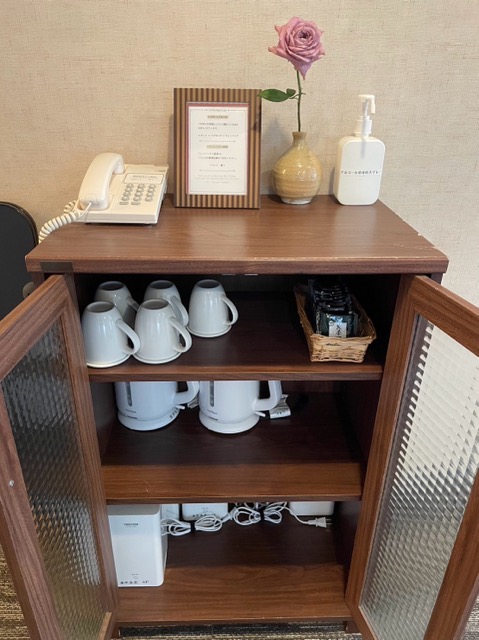 お部屋にポットやマグカップはなく、エレベーターホールにある棚に入っている。