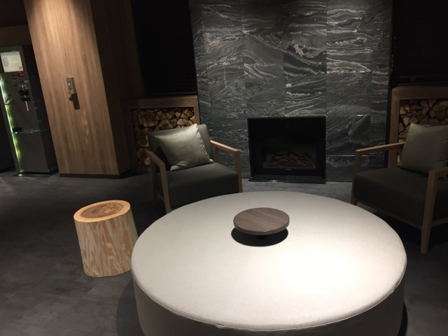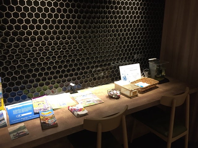 ロビーに小さな水槽あり。椅子やテーブルがお洒落に並ぶ。