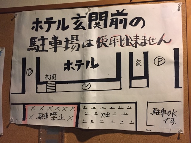 「なるたけホテル寄りに駐めてください」と不思議めの注文が。
