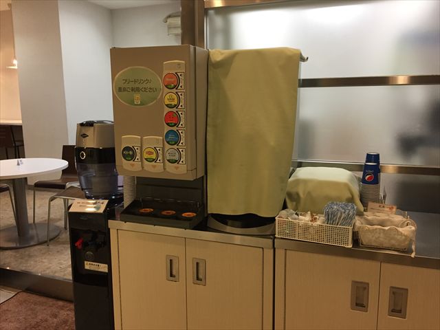 ロビーにドリンクバーみたいなのあって24時間飲み放題。