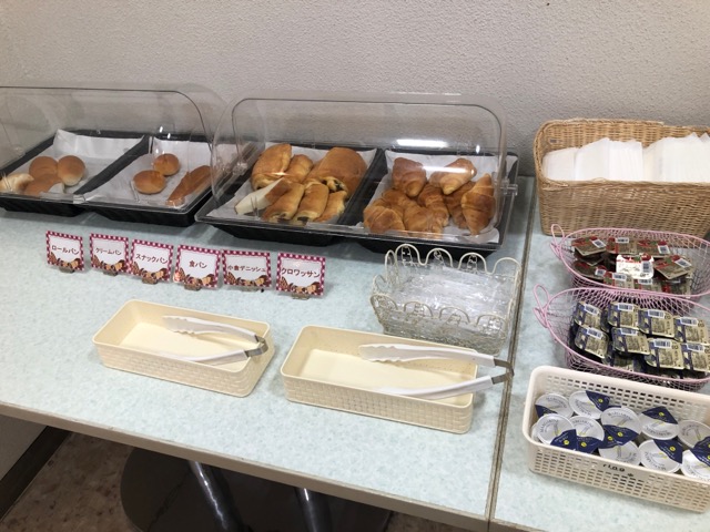 相変わらず朝食はパンしか無いけど無料でこんなにいろいろパンが食べられるのは嬉しいよね。