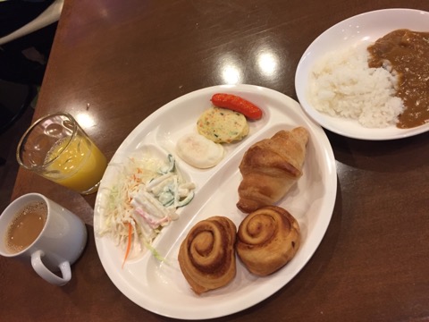 朝もカレーが食べられる。良い。白いオムレツ珍しい。