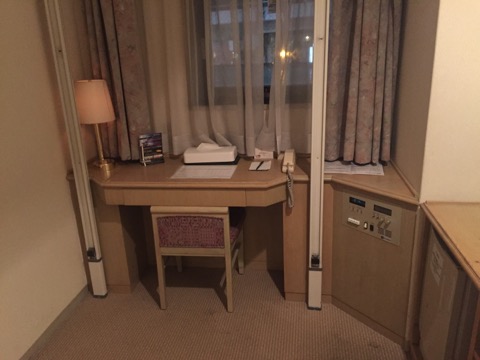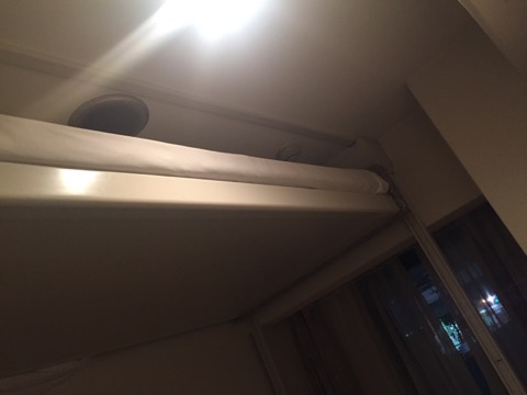 部屋のベッドは上下に動く。上げると机椅子が使えるようになる感じ。