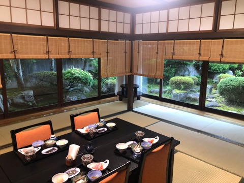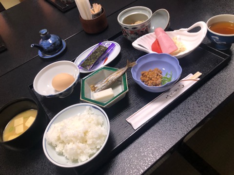 朝食会場から見える庭が綺麗だった。肺次くんは納豆が苦手。
