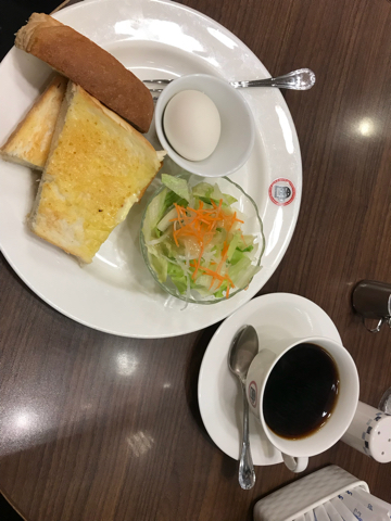 朝食は駅のUCCに食べに行くシステム。530円のホットドッグかトーストは朝食券で食べられて、それ以外もその場で追加料金を払えば選べる。