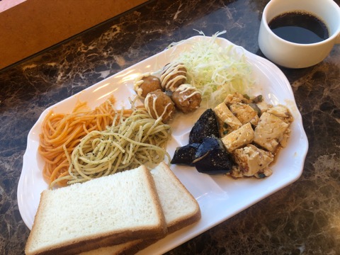 朝食はスパゲッティや唐揚げ。最近おにぎりは無いのかな。