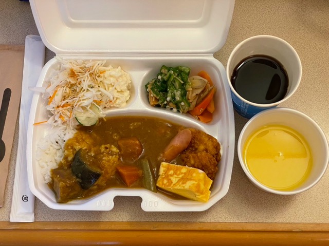 東横インで想像する感じとはだいぶ違って、スープいくつかあってご飯温かかったし茄子がゴロゴロしているカレー美味しかった。