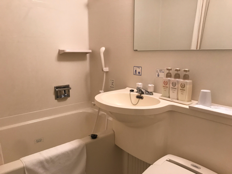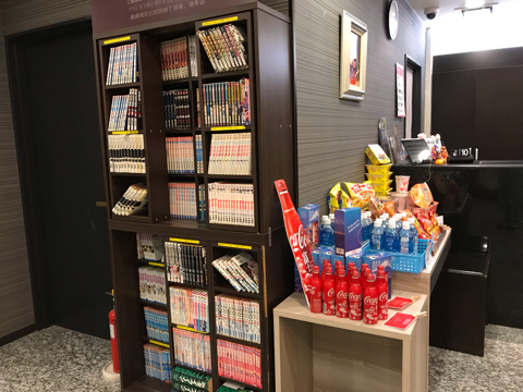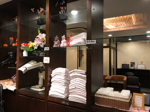 もらえるアメニティーの棚の横にプラスチックハンガーがたくさん置いてあって、洗濯物を干せたので嬉しかった。
