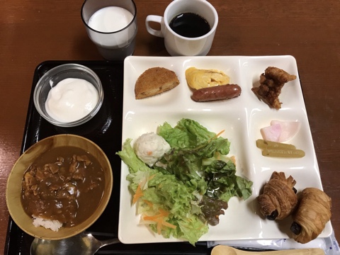 朝食は1階にある居酒屋でバイキング。団体が多くて補充が間に合ってなくて大変そうだった。