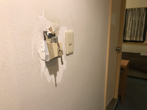 部屋に入って壁のホルダーにキーを挿そうとしてびっくり。なんかテープで留めてある。