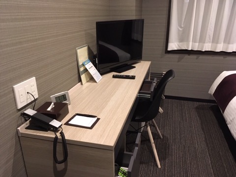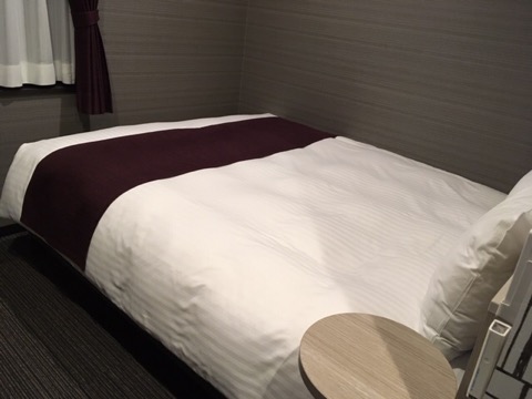部屋はシンプルだが清潔感もあり、ベッドはダブルベッドサイズで広々。サイドテーブルも設置されている。そして枕元に充電用のコンセントがあるのが嬉しい。すごく広いわけではないがシングルで泊まるには十分。