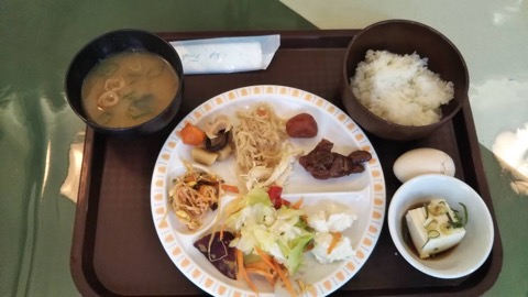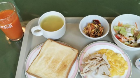 和・洋・韓という感じか。卵は、生、茹で、スクランブルと3種類。ビビンパの具のようなものやコチュジャンも置いてある。生野菜はなく茹で野菜だった。謎に満ちているがいやな感じではなく、ちょっと楽しい。