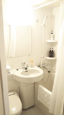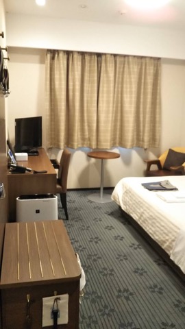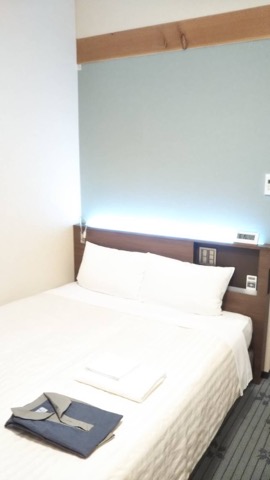 部屋は綺麗、ベッドはダブルサイズ、部屋にお風呂もついているが、宿泊者は温泉施設の無料券がもらえる。