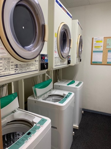 一階には漫画コーナーが充実、コーヒーも飲める。その隣はランドリーコーナー。洗濯機は3台。無料。乾燥機は30分100円。かなり助かる