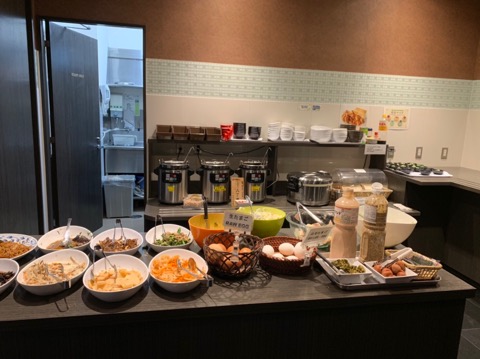 朝食はバイキング。おかずも割とある。パン、ヨーグルト、シリアル、ご飯、カレーなど。