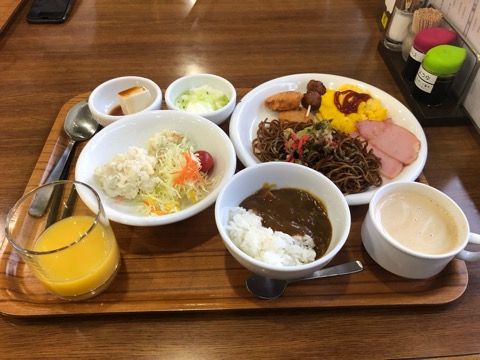 朝食は1階レストランでバイキング。焼きそばをメインに食べた。