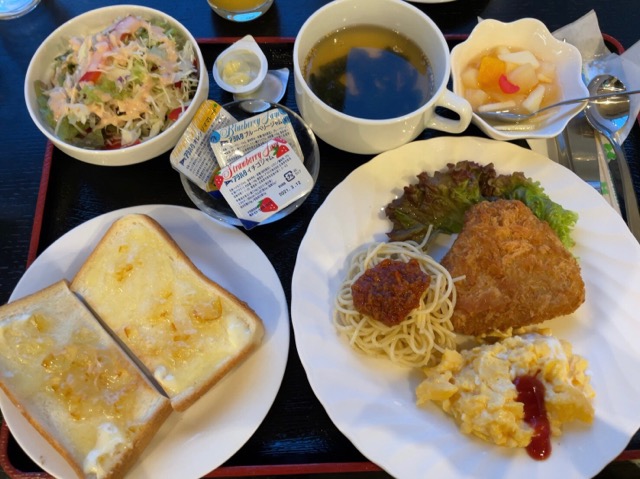 朝食は700円の「しっかり朝食」をつけてみた。普段はバイキングみたいだけど、このご時世で和洋メニューから選ぶようになっていた。飲み物は朝食を頼んでない人もレストランで飲める。