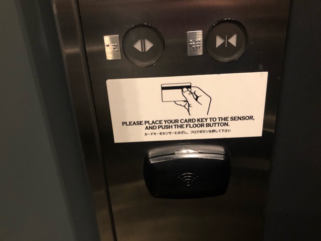 エレベーターは1階から乗るとカードをタッチしないと動かない。