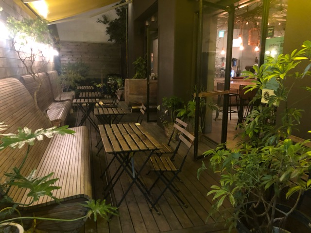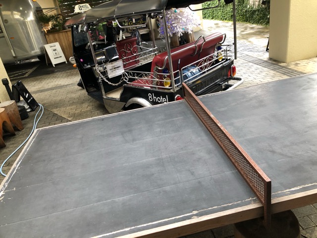 エントランス前に金網の卓球台とかブリキのワゴンとかがある。